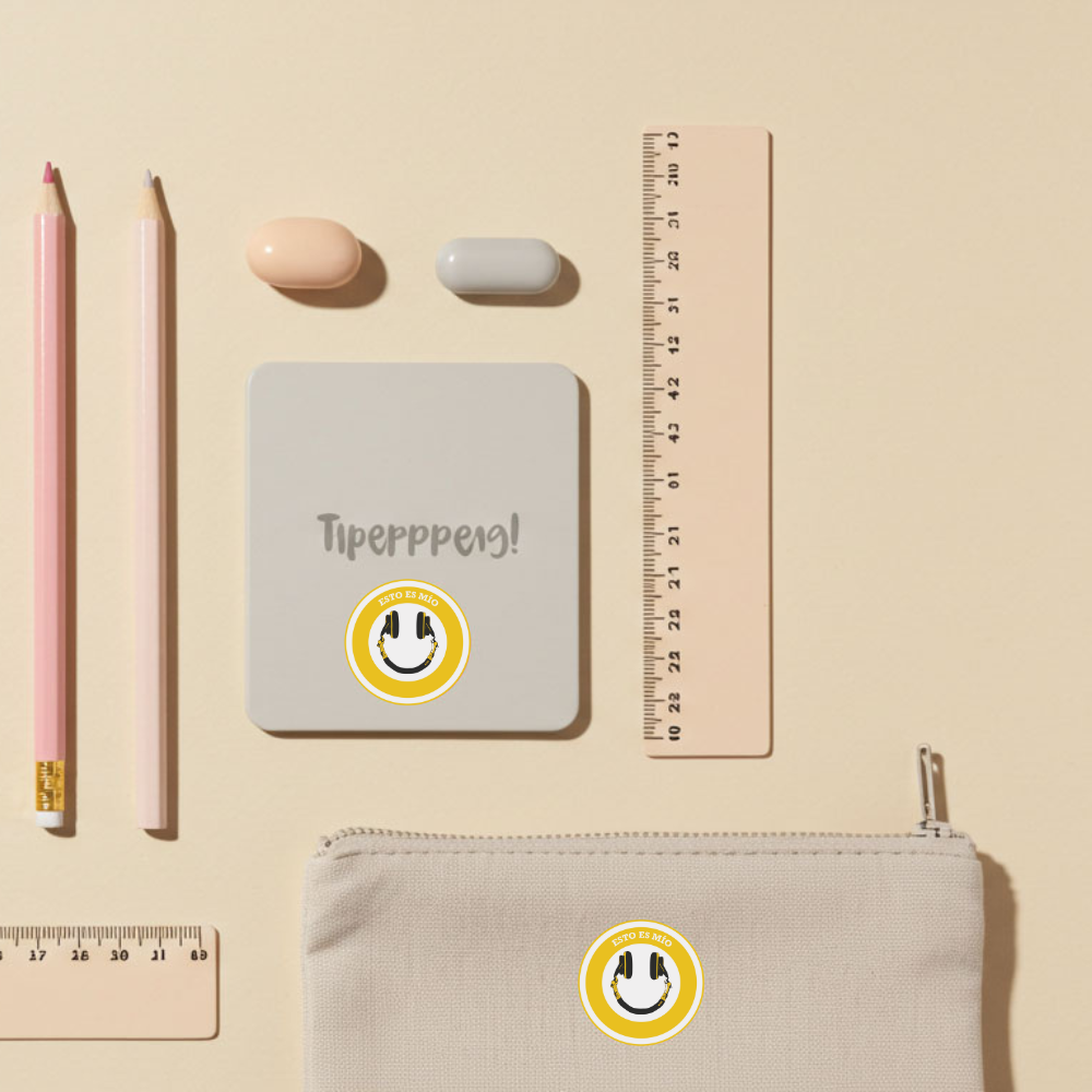 Sticker con diseño de audífonos y nombre personalizable. Puedes escoger entre planchable para ropa y mochilas, o impermeable para botellas, loncheras y útiles escolares. Durable y resistente al uso diario.