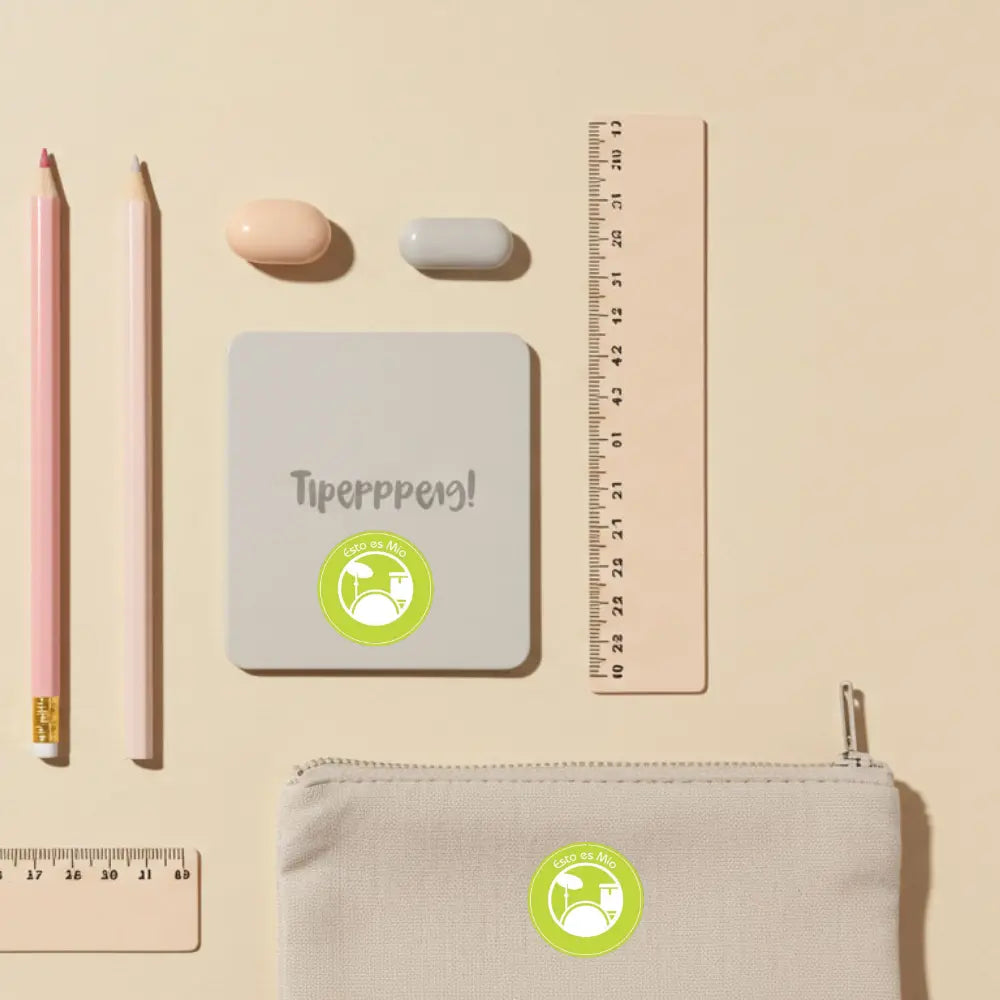 Labels con diseño de batería musical y nombre personalizable. Puedes escoger entre planchable para ropa y mochilas, o impermeable para botellas, loncheras y útiles escolares. Durable y resistente al uso diario.