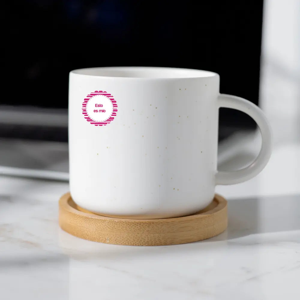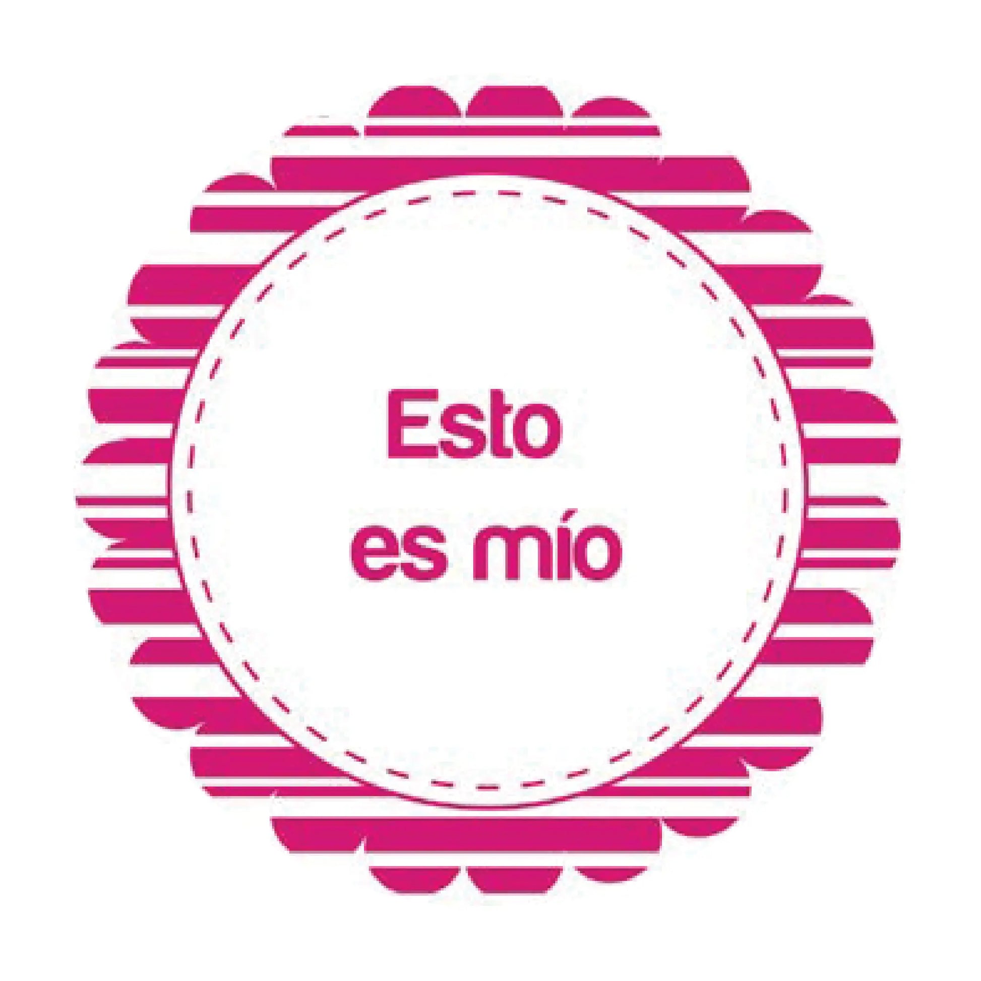 Label circular en color rosa personalizable, disponible en versión impermeable para botellas, loncheras, frascos, envases y recipientes de cocina, o en versión planchable para ropa, mochilas y uniformes; un diseño resistente, práctico y pensado para el uso diario en casa, escuela u oficina.