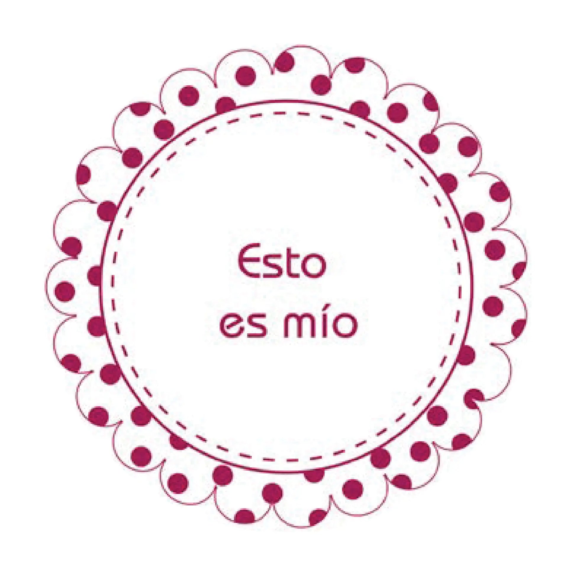 Etiqueta de la colección Droptags, con diseño circular en color fucsia y borde decorativo con detalles de puntos. El texto central es totalmente personalizable, ideal para identificar objetos personales, frascos, cajas de alimentos o detalles para eventos. Su estilo llamativo y elegante aporta un toque único de organización y distinción.
