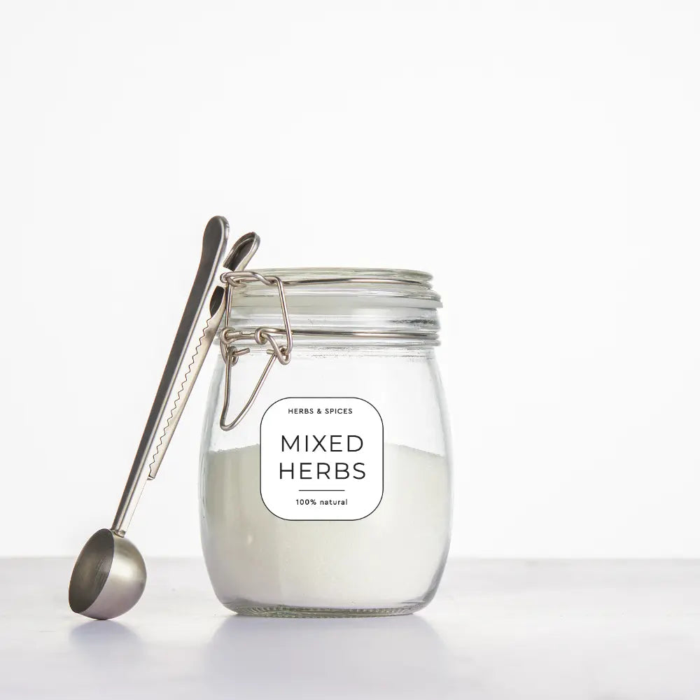 Label personalizable ideal para la organización de hierbas y especias en la cocina. Disponible en versión impermeable, perfecto para frascos, botellas y envases que se utilizan a diario, o en versión planchable, pensado para manteles, bolsas de tela o paños de cocina. Su diseño moderno y práctico lo convierte en una solución resistente y funcional para mantener todo en orden con estilo.