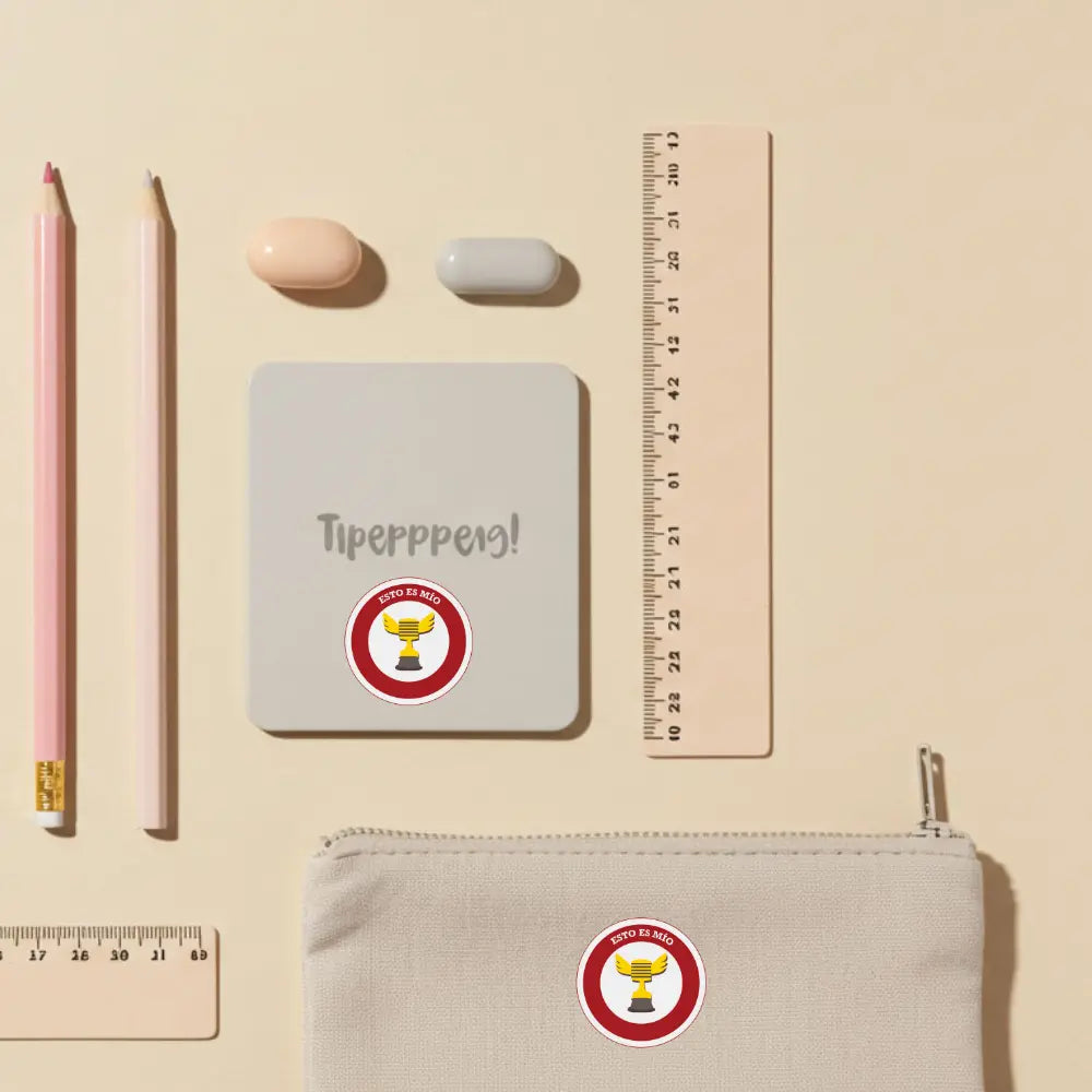 Sticker con diseño de trofeo y nombre personalizable. Puedes escoger entre planchable para ropa y mochilas, o impermeable para botellas, loncheras y útiles escolares. Durable y resistente al uso diario.